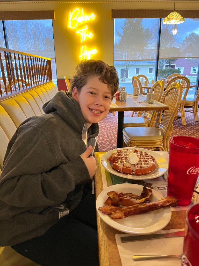 We went to the show, looked around a bit and went to bed. The convention has a deal with the Astronomical Pancake House and of course the boys were starving in the morning so we headed over before the morning game session began! The waffles are big, but the pancakes that passed by us were positively, well, astronomical! Check out that perfectly cooked corned beef hash!