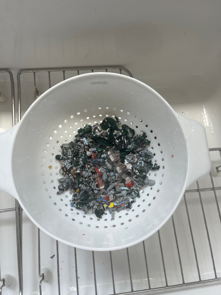 It is doing a much better job with the metal pieces but I’m still having a hard time budging the paint off the plastic pieces. Looking into my bits you can see some of the paint hasn’t budged at all! Still I can highly recommend LA’s for metal. Some pieces had tarnished and LA’s helped me scrub it right off getting the figures bright and shiny. Still, if you have any ideas for stripping plastic please comment below!