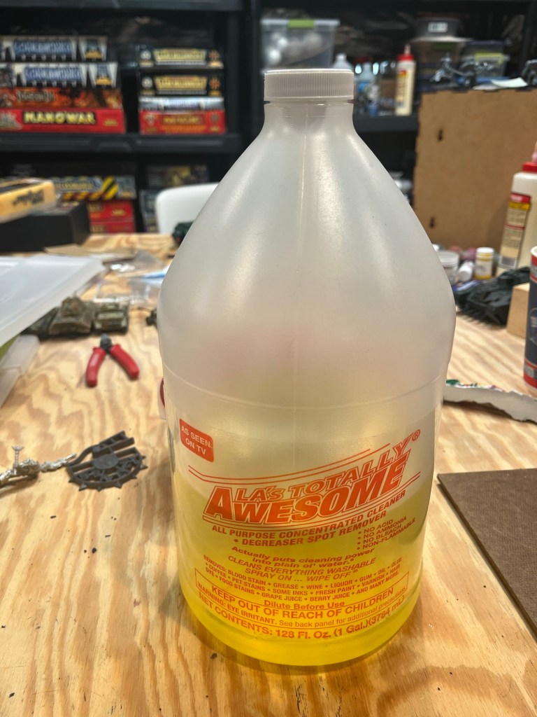 Normally I use Simple Green to strip paint from my miniatures. It has worked wonders for the metal parts but it hasn’t done much for the plastic parts. A friend suggested I try LA’s Totally Awesome so I have it a shot.