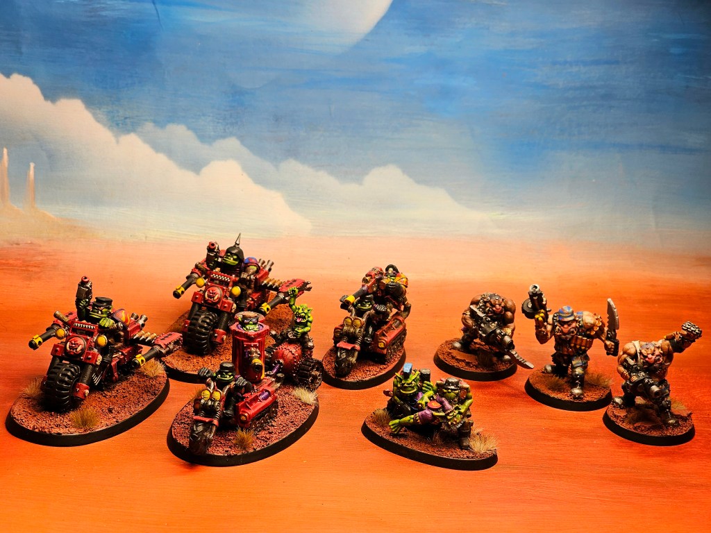 With this months pledge done, that’s the original plan for this challenge completed! Ive got a few more additions for my force however, so am planning on using next month for those extra troops! This month, however was all about the Speed Freaks that I had to paint up. Specifically a mob of Ork bikers and a couple of additional Speedsta’s. The Ork biker, with twin auto cannons can be particularly deadly and packs such a punch that these can often be bullet magnets in the early rounds, allowing the rest of the army to get into position, and if you can manoeuvre around the table then they can provide a deadly flank assault on enemy infantry or artillery at the rear of their force. In light of that, I have taken a group of 4 bikes, with and Nob to lead them into the fray.