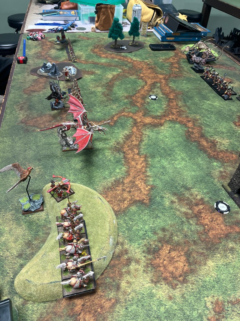 When my scheduled opponent was unable to make our game I was lucky enough to join in my buddies game. The High Elves were my original army going back to 3rd edition, and I still own a Tomb King force so I was happy to take some troops from either side. My buddy offered me a few High Elf units and I was happy for the chance I’m considering putting together a High Elf army again! The best part of the night was I didn’t have to put together an army list, something I’m notoriously bad at, and something I really don’t like doing!