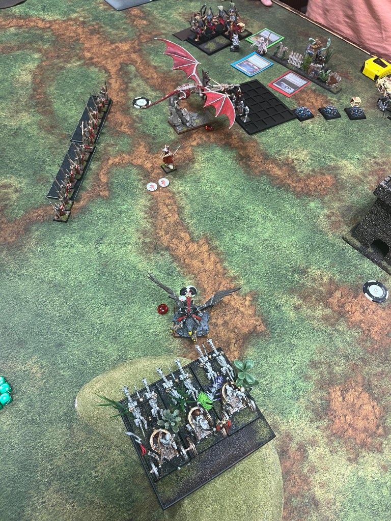 The Tomb King turn was less exciting and just saw a few more Lothern Sea Guard taken out by foul sorcery, and the Skeleton block come back to life due to the foul sorcery of the Mortuary Priests giving the Dragon more skeletons to break apart. Just enough skeletons came back to life so the General and his mount could not kill enough to finish off the unit.