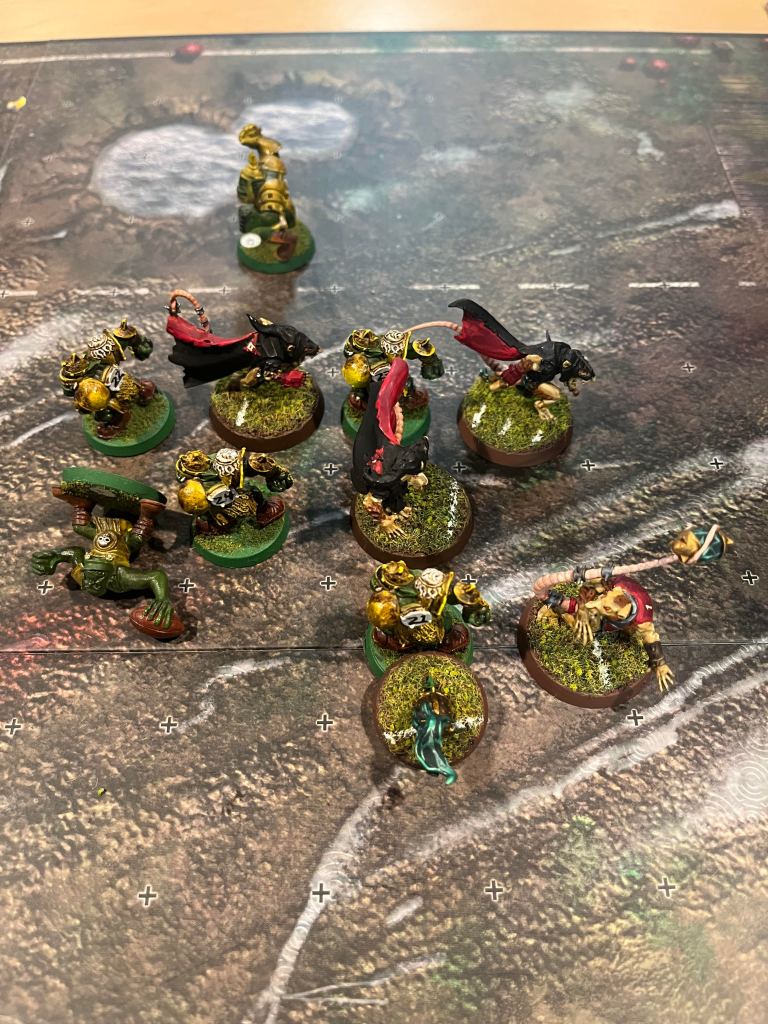 In my boys game they made it slightly over halftime with the plan to finish tomorrow. With the game at 1-1 the Lizardman player ran his skinks away from the ball, forgetting he didn’t have possession. The Black Orc player was able to send a goblin to pick up the unattended ball and run into the end zone bringing it to 2-1. With 6 turns left can the Lizardmen rally? I guess we will find out tomorrow!