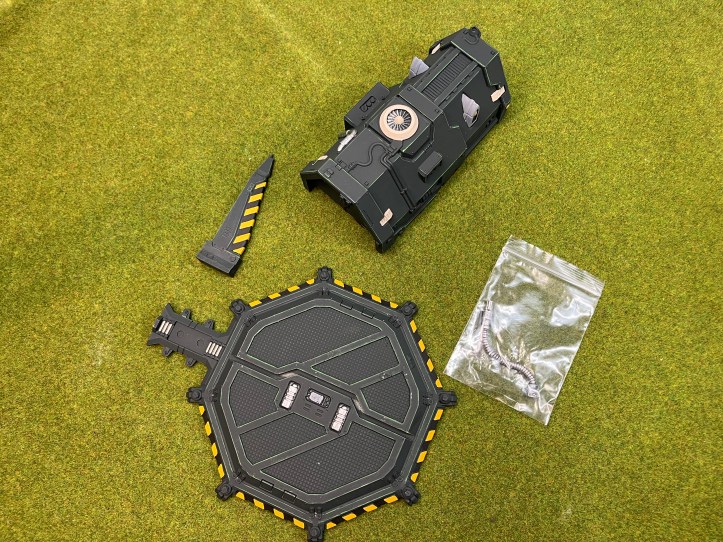 The Legion Chapel Barracks come in five pieces. The launch pad, the spire, the barracks, an antenna, and a power cord which runs from the barracks to the launch bad. It also comes with magnets to connect the barracks and the spire to the launch pad. The antenna can be dry fit into the barracks so it doesn’t snap off in storage. This is a fun kit and it provides both blocking terrain via the barracks, and flat terrain via the the launch pad. This kit is $30 USD and cast in a hard plaster like material.