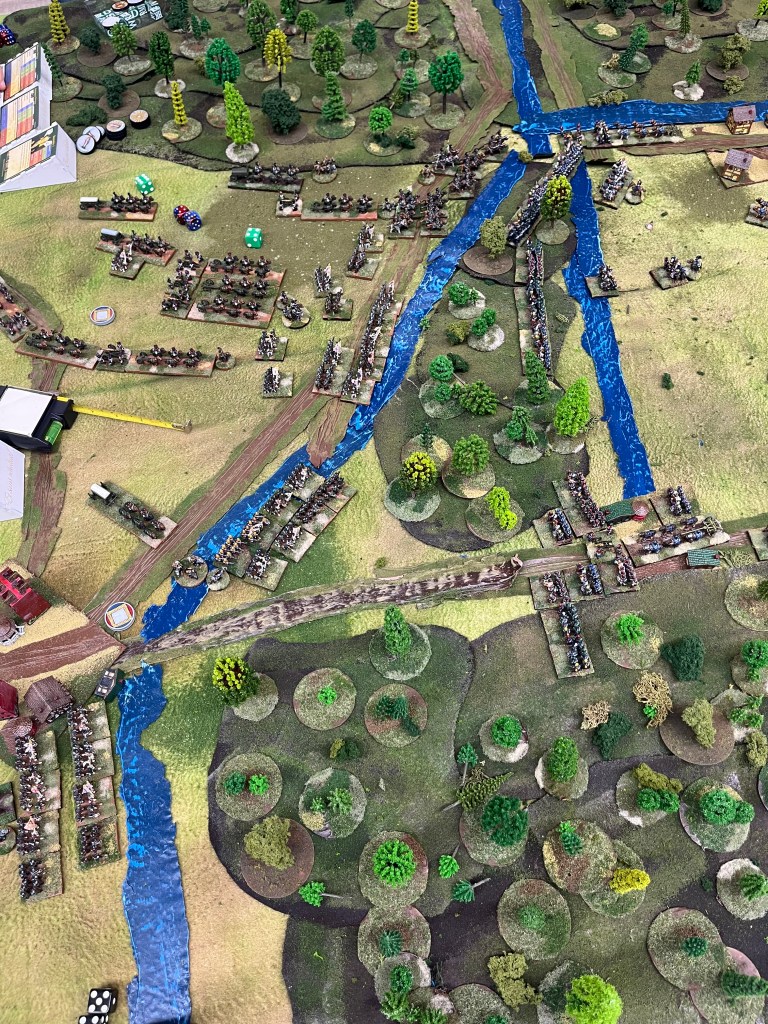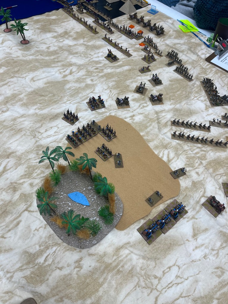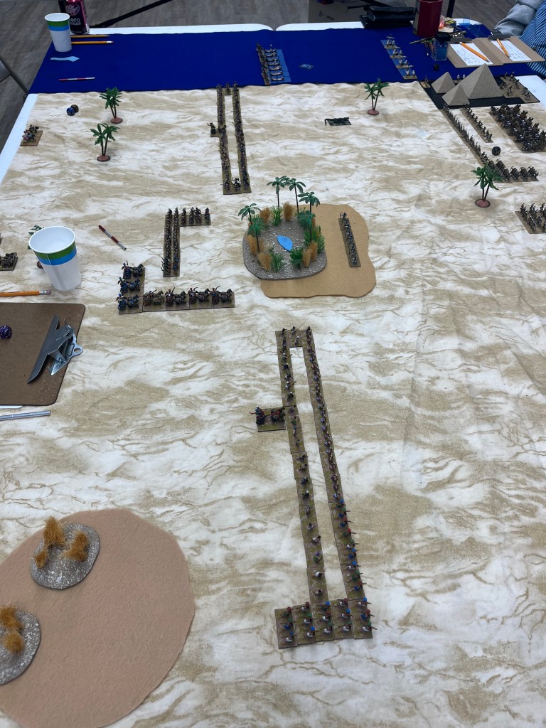 My son and I joined a terrific group of guys in a game of DBM where we took on the role of the Sea People invading Egypt. We didn’t quite get to a full resolution but we were pushing their troops back into the Pyramids themselves where they hid their baggage, so I’d say we were pretty close to a victory!