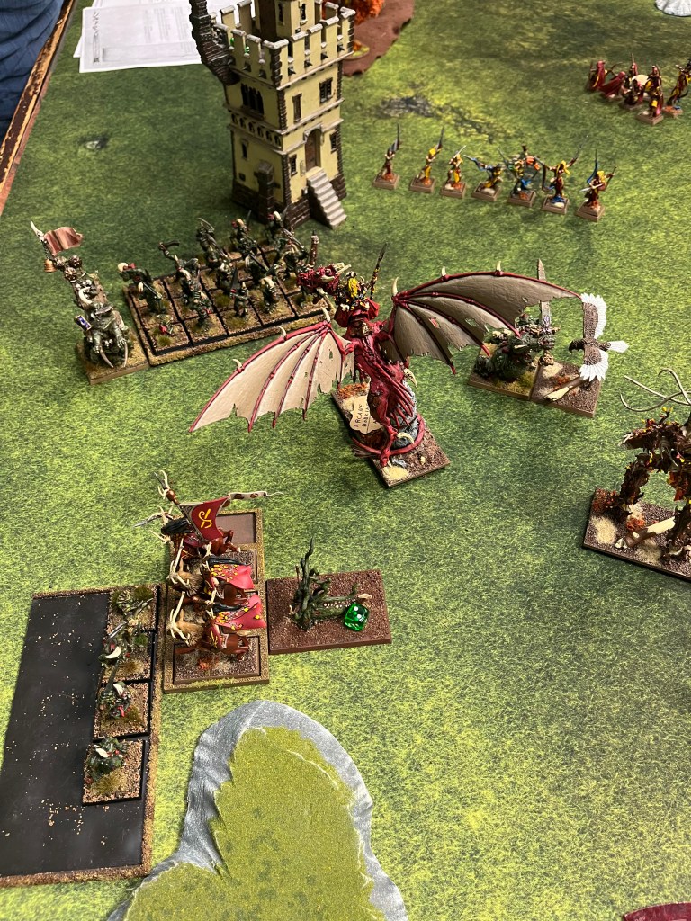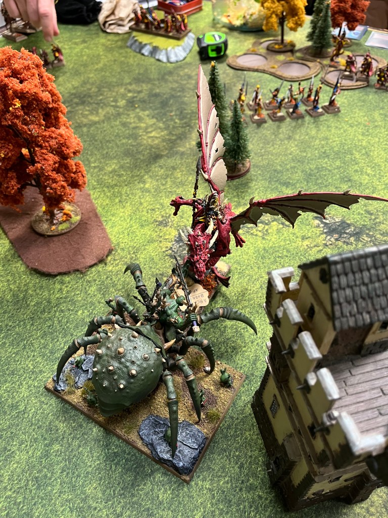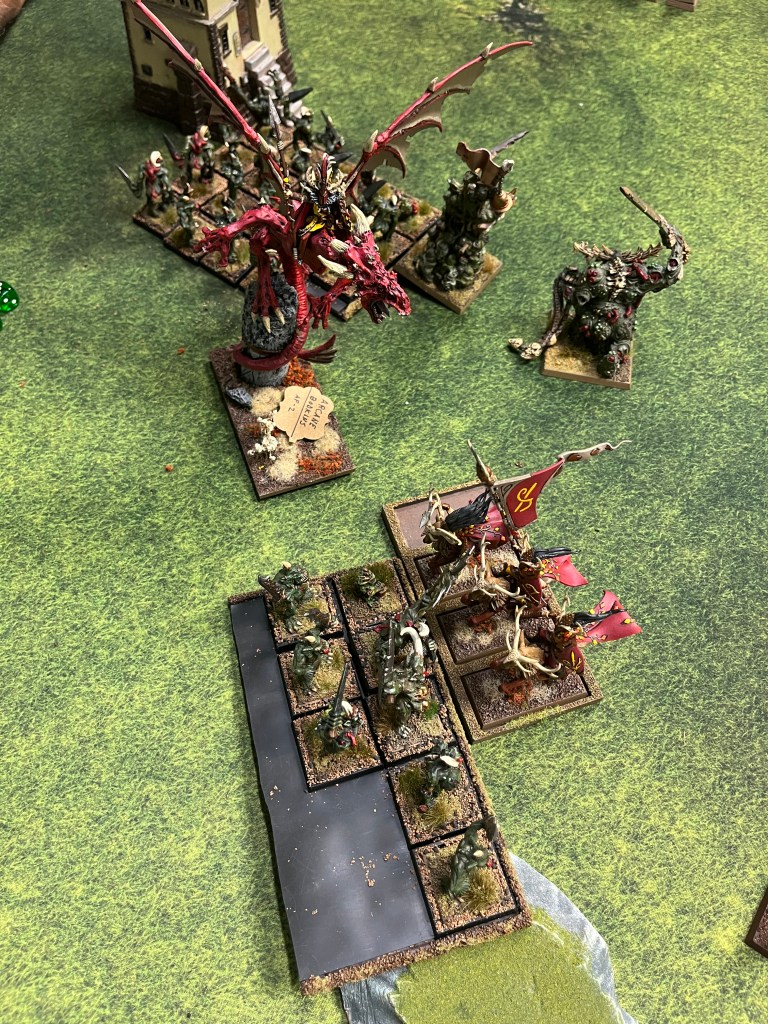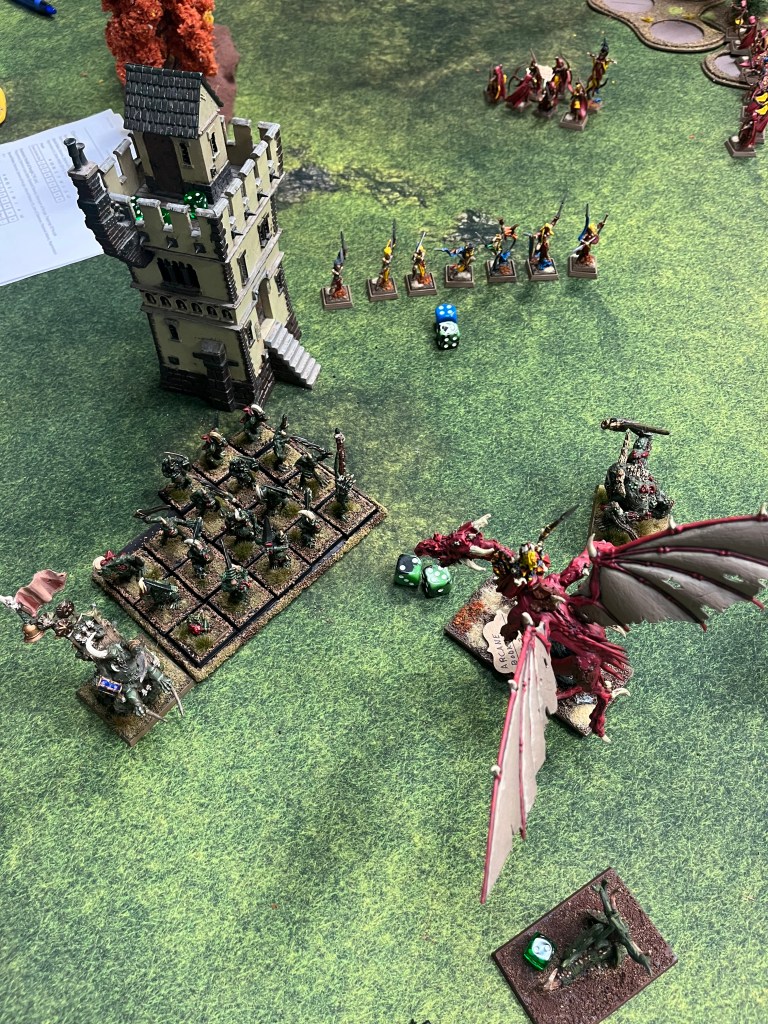 In the Wood Elf turn the archers moved to shoot the Nurgling menace and the Lord charged the beleaguered Plague Bearers. (I’m not sure how the Beasts and the Dragon ended up in combat on the same turn when they weren’t the previous. It was all above board I assure you!) The archers continued to soften up the Plague Flies in the shooting phase and the Wood Elf mage failed to hurt the Great Unclean One. In combat the lord killed the champion, the Plague Bearers provided more resilient and didn’t lose any of their number to the Wild Riders, but all the Nurgle daemons only killed one Wild Rider in return. The surviving Nurgle Daemons fell back and took wounds from their Daemonic Instability test. The Wild Riders reengaged the Plague Bearers while the Lord changed his facing to look for more lucrative targets.