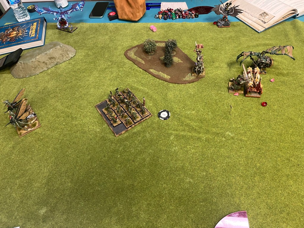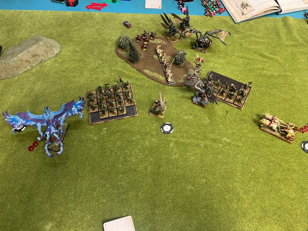 The Plague Drones didn’t like being shot at, and liked the thought of being charged by the Lord on Griffon even less so they charged the archer unit with the hope of chasing it down and getting out of the charge arc of the winged beast. The Daemon Prince had a similar plan with jumping on the Bolt Thrower and overrunning the crew to avoid the Frostheart Phoenix. With nothing else to do the Plaguebearer block charged the remaining Reavers, fully expecting them to flee. The brave horsemen opted to stand and fight instead! The Daemon right flank moved forward to get to grips with the elves opposite them. The Plague Drones beat the archers in combat and chased them down, their swift stride getting them out of the Griffons arc of sight, the Daemon Prince made short work of the offending bolt thrower and also over ran out of line of sight. The Plaguebearers were not surprisingly able to beat the Reavers but only managed to kill one of them. They were able to gain a few inches by overrunning and the lone Reaver would never rally.
