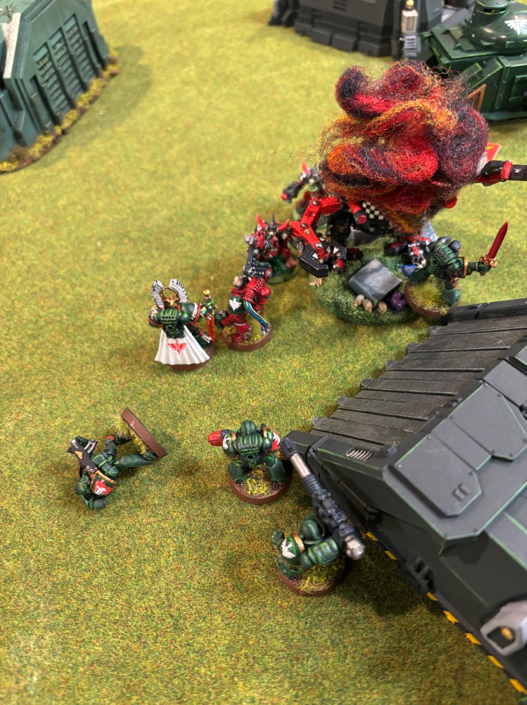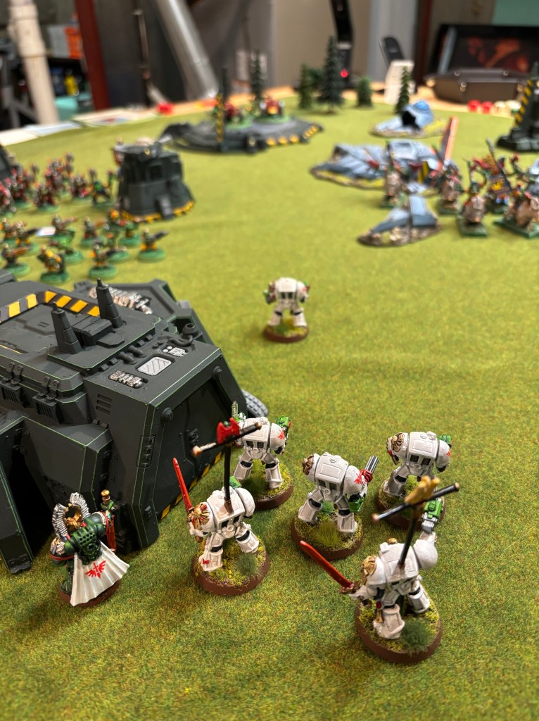 In the Ork turn the broken Gretchin fell back, and despite trying to rally throughout the rest of the game they never rallied. The Skorcha rammed the Predator who was tormenting the Ork lines blowing a track off and causing it to go out of control. The Dreadnought exploded but the Gretchin were now just out of range as they were legging it across the field. The Ork Traktor Cannon grabbed on to one of the Terminators and dragged him forward but didn’t kill him. In “something actually went actually right for once” the Ork Shokk attack gun managed to lodge some furious Snotlings in the other Predator. While there was no immediate damage the tank would need to test to see if it exploded on a 6 at the beginning of every turn. While it never exploded it did prevent the Predator from counting as undamaged and thus unable to achieve the Dark Angels Dawn Raid mission. Meanwhile an Ork buggy killed two Tactical Marines as they advanced up the field.