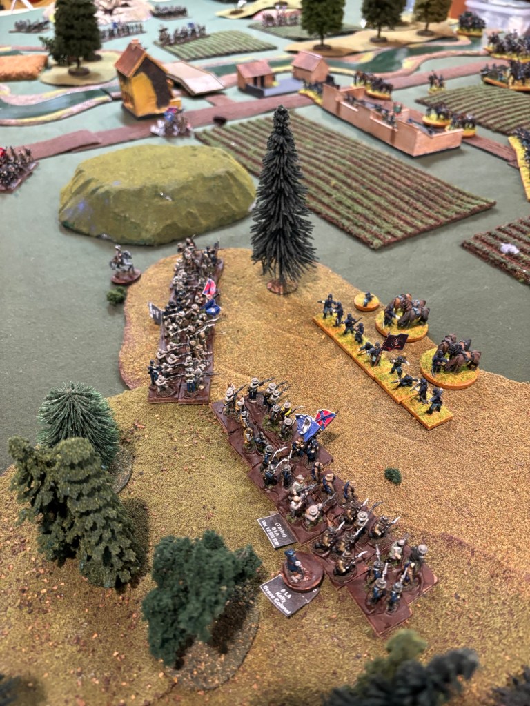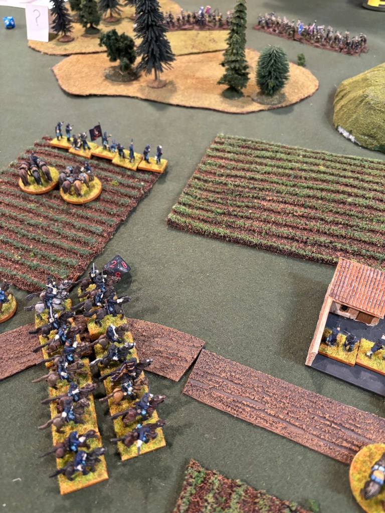 My buddies played Regimental Fire and Fury. The Union had sent their cavalry to scout the Confederate lines. The Confederates were set up with hidden deployment. The game was called a Union victory as they were able to achieve their scouting mission and make it out relatively unscathed.