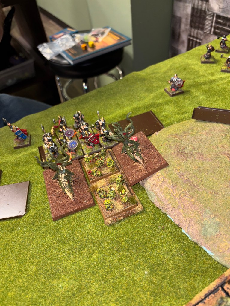 The Dwarfs took a a defensive position castling in the left corner of the field, shockingly using the hill for some of their ranged elements. This deployment looks very familiar to me for some reason….