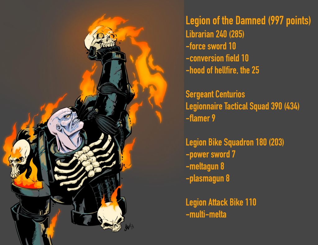 In the first month, I’ll tackle five bolter-toting tactical marines. In the second month, I’m hoping that my missing Sgt. Centurius model will decide to show up in typical Legion of the Damned fashion—just when I need him most. If not, I’ll use a regular sergeant (probably the one from the Devastator squad), along with three marines with bolters and one with a flamer to finish off my tactical squad. For the third month, I’ll focus on a Librarian. After all, there has to be a Librarian behind all their trickery. I might need to do something about that unhelmeted head, though. In the fourth month, I’ve decided to paint a Bike Squad. I’ve always loved Space Marine Bikes, but I’ve never painted any for myself before. Plus, a squad of Ghost Riders will look rad. Finally, for the fifth month, I’ll take a victory lap with an Attack Bike to round out 997 points of Legion of the Damned. I’m really excited to get started and see what everyone else is working on.
