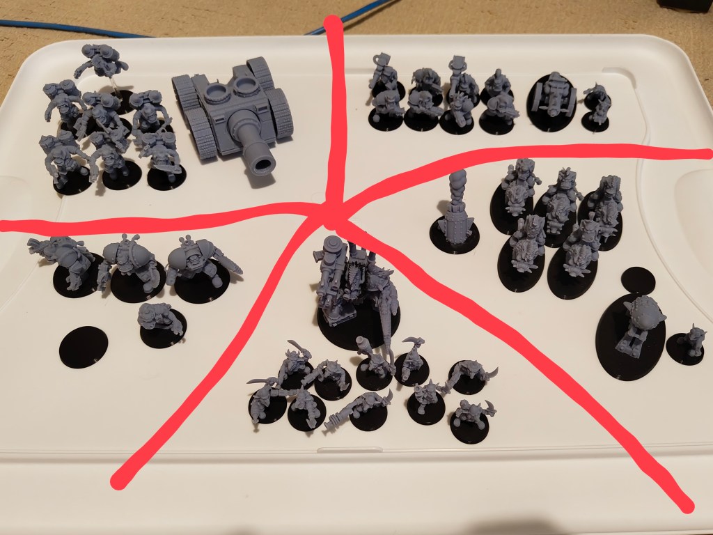 I’ve split my initial 1,000pt force into 5 slices, which gives me a nice base to work from. These slices may be done in a slightly different order, but they’re the minimum I need to get done: