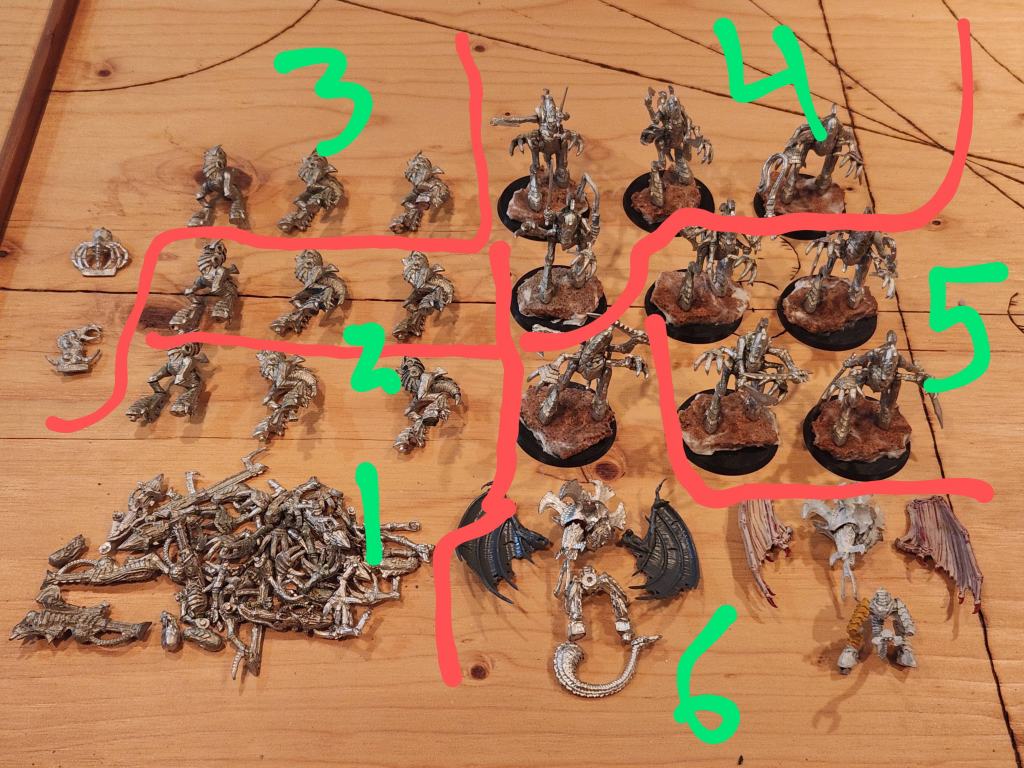 Back for a third challenge, I will again be doing Tyranids, trying to round out the extent of my 2e ‘Nid collection. Work and family have conspired to reduce my painting output this go around – six kids are no joke; the swarm grows! 🙂 We’re numbering only twenty-two models, total, for the pledge itself. This is less than the total number of models I pledged in a month last year, but c’est la vie, as they say! What the models lack in number, they make up in expression. This go around, we’re all Tyranid Warriors, all Tyranid time! 18 warriors, to be precise, nine dedicated to ranged weaponry, nine dedicated to claws-on melee. The amount of poseability and dynamism in these sculpts is a beautiful thing to see. I’ve also added two Hive Tyrants to the mix, who will each be getting a pair of wings (modern ones – you can’t win them all 🙂 ) and two very fun squig ripper swarms I picked up in a happenstance eBay purchase earlier this year. With that being said, I have some other models I’m hoping to toss in as bonuses over the coming months, but I anticipate this pledge will keep me plenty busy!