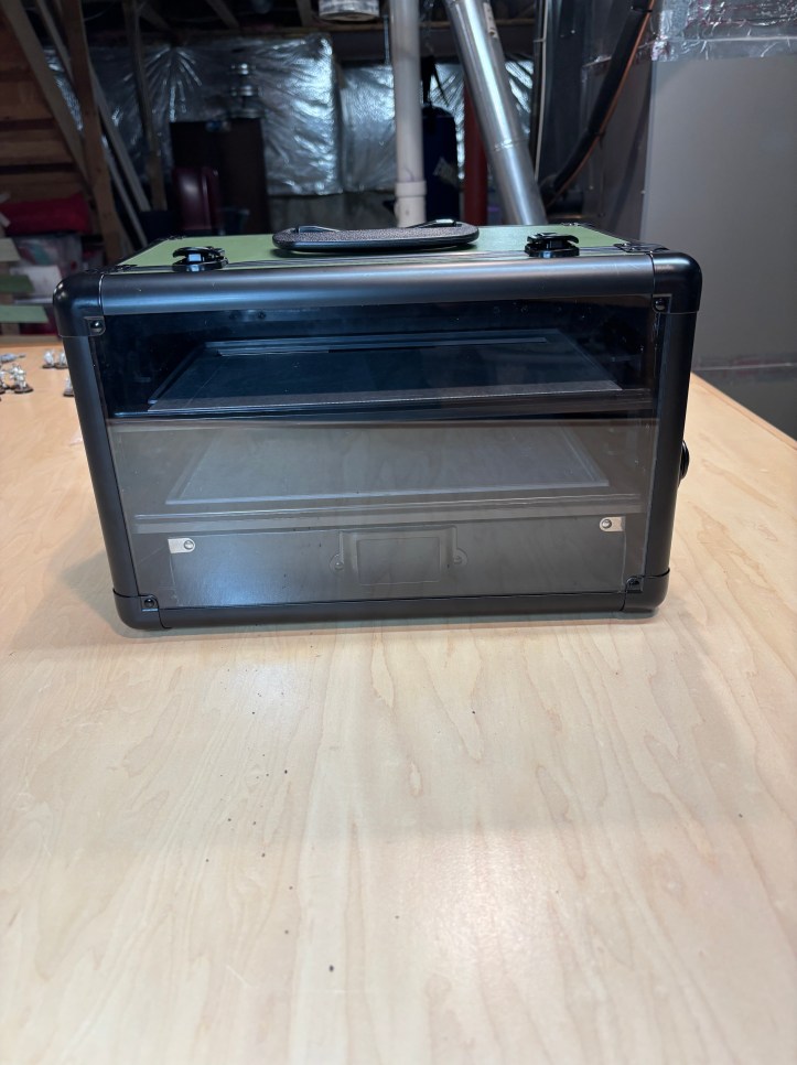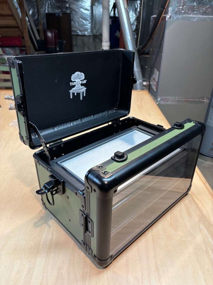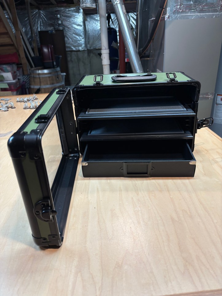 The Mini case comes with two trays, two metal inserts, and a drawer. It is well built and feels very sturdy. The front of the case is clear which allows people to see your miniatures without opening the case. This is a fun way to show off your figures and it allows airport security to glance inside without necessarily having to open the whole thing up. From a more cynical perspective this case looks like it could be carrying all sorts of items worth stealing to those who are not interested in the hobby so being able to show it contains miniatures not tools, firearms, or anything else of high value might save your case from being stolen! Speaking of being stolen the case has latches that can be secured by a lock if you would like some extra security. This replaces the previous versions combination lock which just might save you from forgetting your own combination!