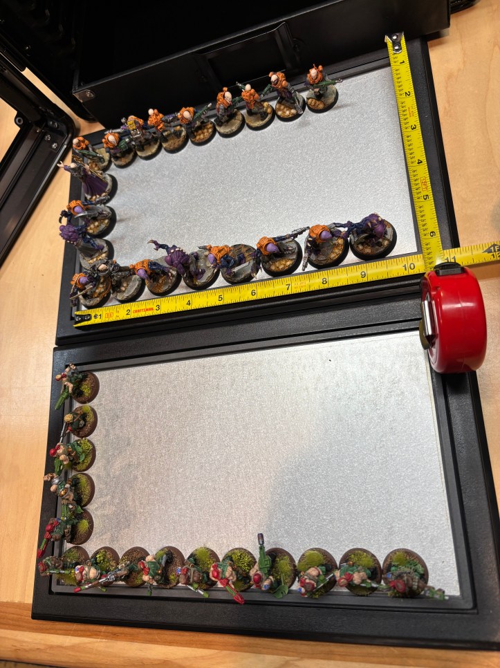As you can see the magnetic portion of the trays are 10.5″ wide by 6.5″ deep. As you can see in the picture below each tray easily holds 60 28mm figures on 25mm bases or 32 28mm figures on 30mm bases with another 10 friends on 25mm bases.