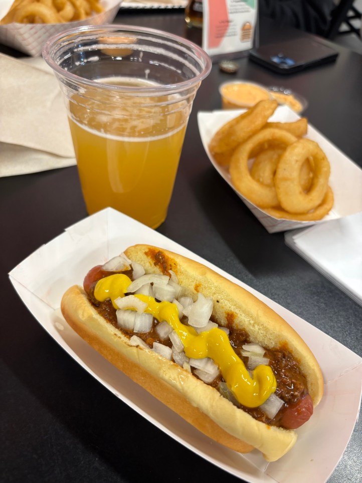 We were still mostly full from lunch so for dinner we went to Dominion Dogs for dinner. They had a wide variety of hot dogs, I went with the classic Coney Dog and it was awesome! The boys had their hot dogs upgraded to have bacon wrapped hot dogs, and they extra crunch was delicious. You better believe I hit them with the dad tax!