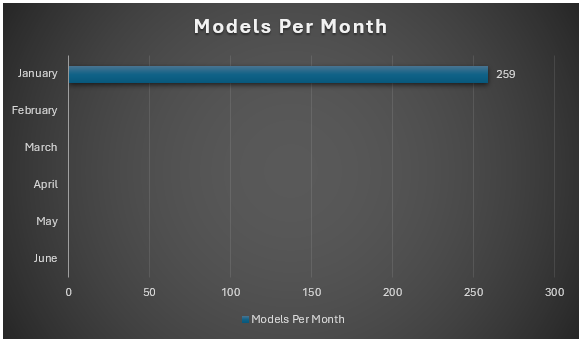 With only 14 contestants last year I was able to break down the exact models per painter, with 40 contestants this year I’m going to have to do range bands! TJM once again took the month 1 most miniatures painted honors with 21 models, while four contestants tied on the left end of the scale with 1 model each!