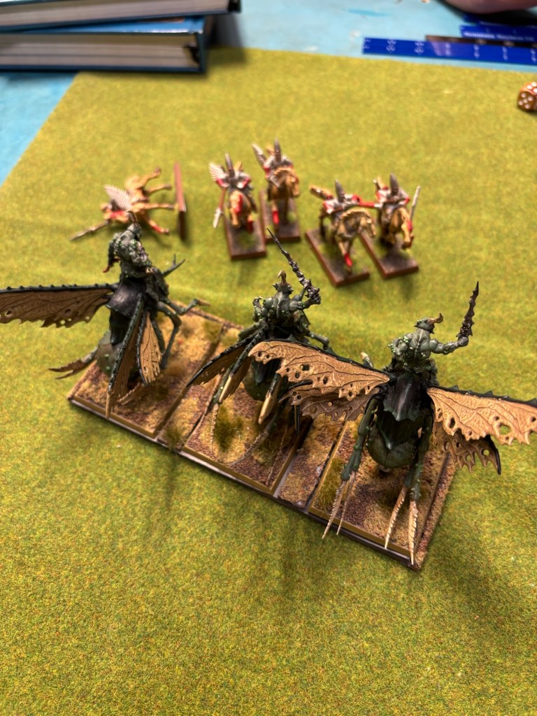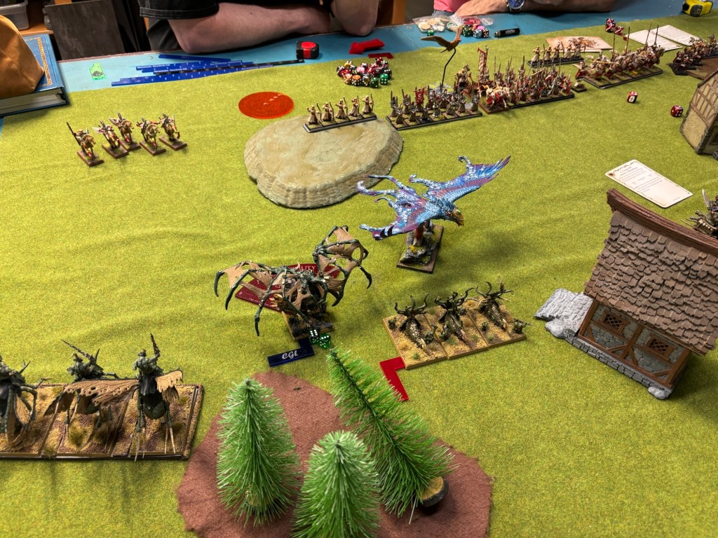In the High Elf Turn the Pillar of Fire moved through the Reavers and the Frostheart Phoenix only killing one of the mounted Elves but putting two wounds on their winged support next to them! The Frostheart flew up to slow the advance of the Beasts of Nurgle while the elven archers killed four of the five Furies.