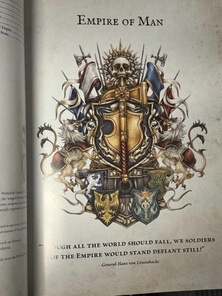 I’ve never played The Empire before and while I have a few units worth of models I’m unlikely to get a full Empire of Man army. For the sake of completion, and to support my local store, I picked up a copy of Arcane Journal Empire of Man. I know I don’t exactly have cutting edge timing on this review, but my copy came in late. I might be late to the party but here is my review! This 48 page soft cover book provides additional background, two Army of Infamy army lists, a scenario, new troop and character types, two special characters and 18 additional magic items.