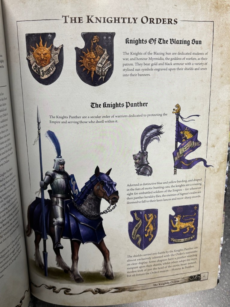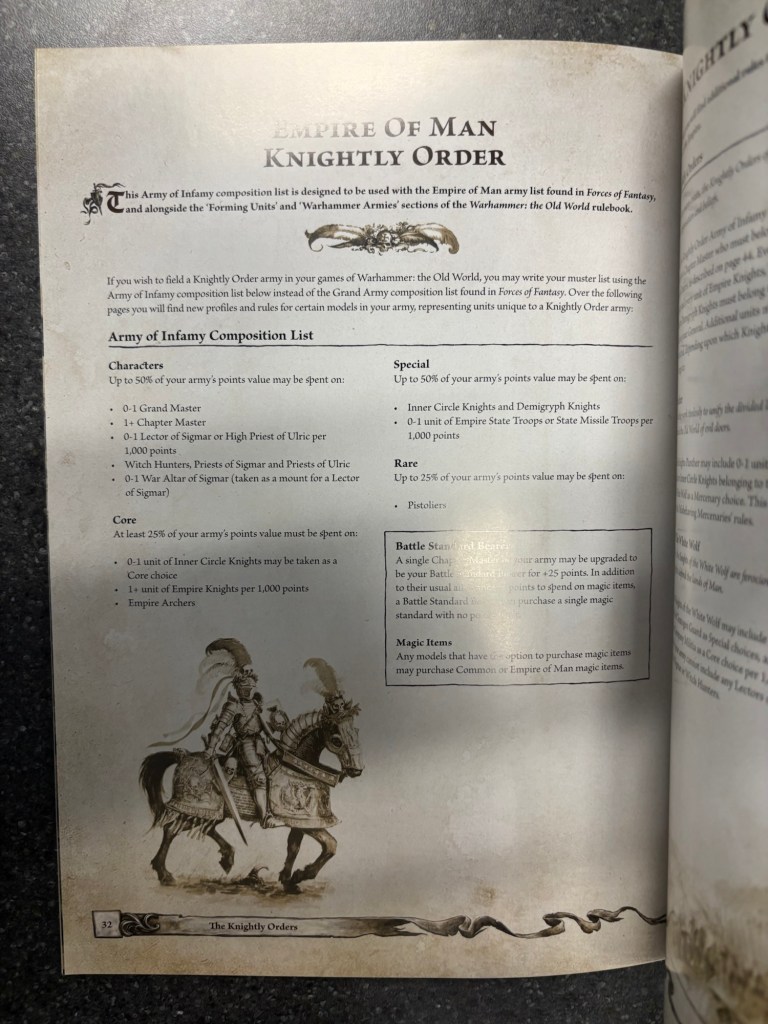 The Knightly Order substantially limits your list building and as you can imagine is designed to be used as an all knight army. In fact 0-1 core troops may be Inner Circle Knights while you need to take 1+ unit of Empire Knights per 1,000 points. The rest of your core may be filled out by Archers. Just archers. Obviously you aren’t here for core, you are are here to have as many Knights as possible! This list allows that! Each of the Knightly Orders has specific build restrictions and allowances but they don’t get much more flexible! With that said the base list does not allow for any Wizards, two of the Knightly Orders, Knights of Morr, and Knights of the Blazing Sun allow you to bring some mages. Each of the Knightly Orders gives special rules to units of Knights, Grand Masters, and Chapter Masters. In the Knightly Orders Army of Infamy each of these units can be upgraded, and in a normal Empire Army list a handful of these units can be upgrades which is kind of fun!