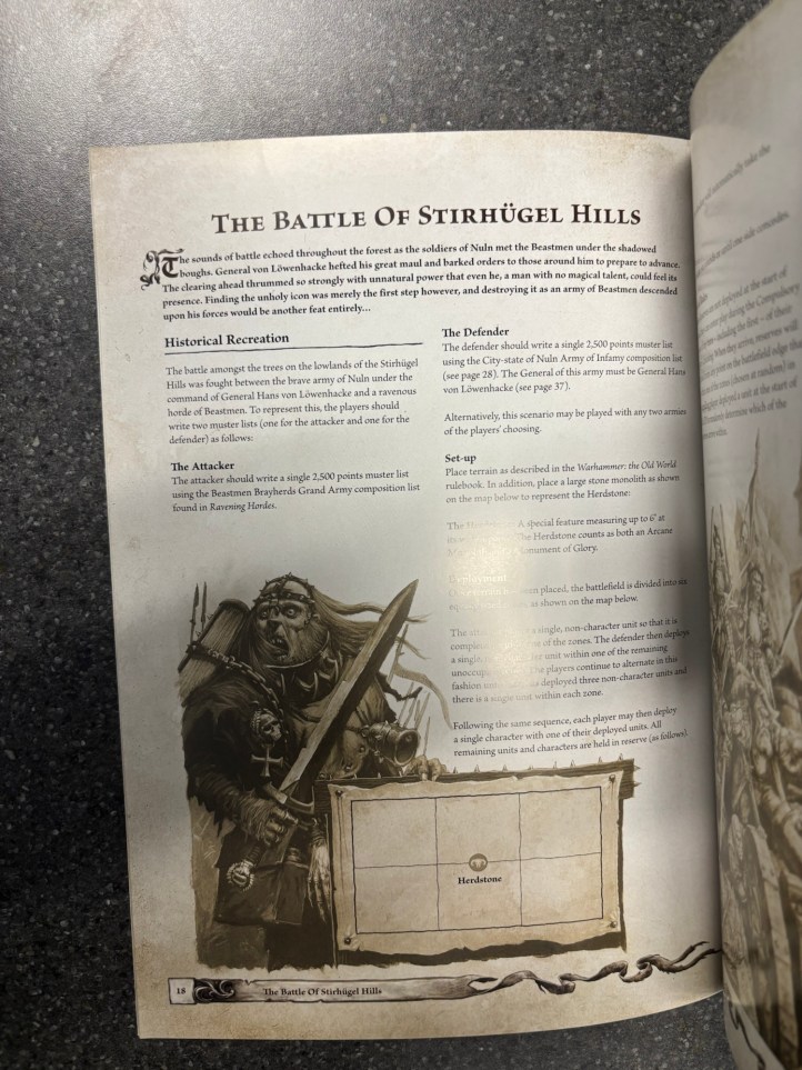 As always I like to take a look at the scenario in the book. There must be a lot herdstones in The Old World because much like the High Elves the Empire of Man the scenario calls for a Herdstone to be placed on the board. In this book the forces of evil are the Beastmen not the Warriors of Chaos, but bad guys are bad guys! I really like this scenario due to the wacky deployment rules. The board is divided into six sections and the players take turns placing a single non-character unit within the sector they choose. They can then place a single character on the board. Everything else comes in as reinforcements in the compulsory move phase, but the catch is they roll a D3 to see which of their friendly sectors they deploy in! This scenario sounds like a lot of fun and it’s probably the first one I really want to play!