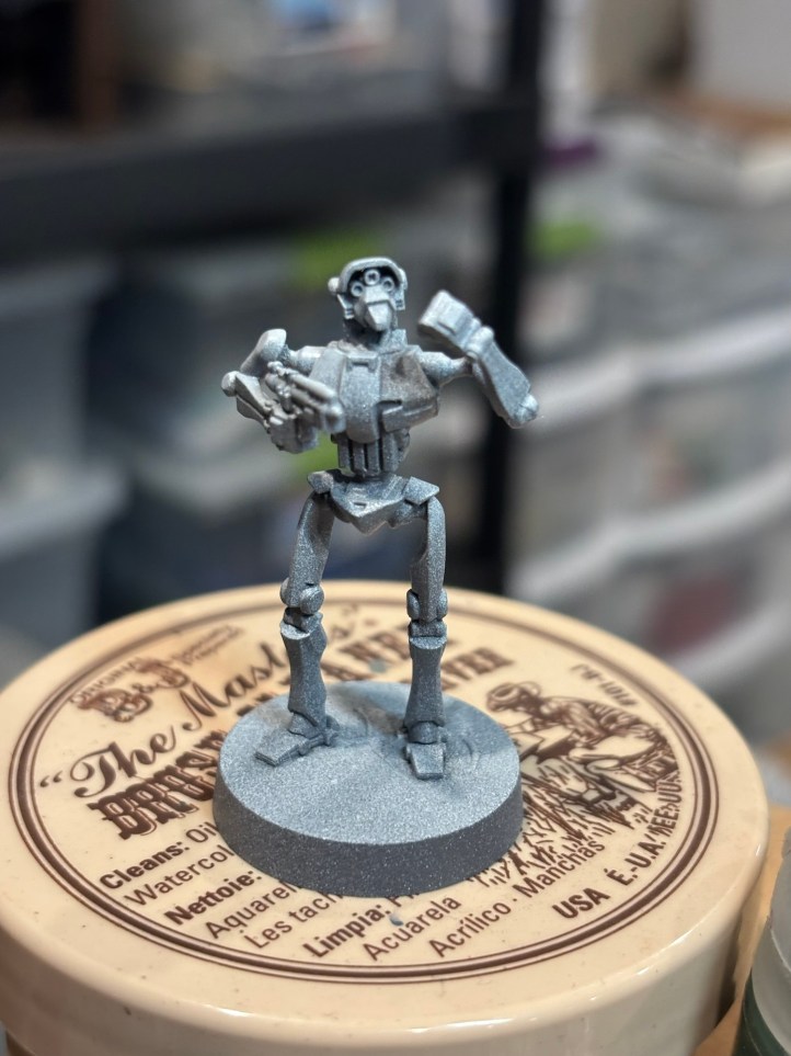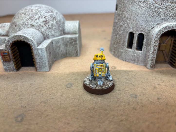 When I realized Star Wars Day, May 4th, was coming up I decided I should paint one of my Star Wars Legion models. I had a few pieced on my desk, including a Super Tactical Droid and the little R5 droid. I suddenly had a flash of inspiration and realized I could use a zenithal highlight for the Super Tactical Droid and get the “use zenithal prime then paint” bingo square!