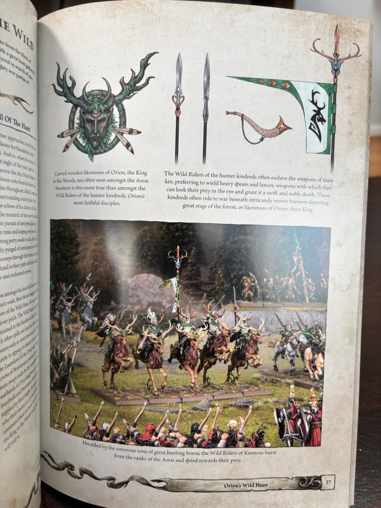 The Orions Wild Hunt list allows one unit of Wild Riders per 1,000 points to count as Core. That one unit and Glade Riders are the only Core in the list so you can tell it is designed to be a primarily cavalry list, although you can take Wardancers. This list does not have a lot of special rules. Nobles can take Talismanic Tattoos, Glade Riders, Warhawk Riders, and Wood Elf Beast Packs can upgrade to have both Furious Charge and Impetuous and the army has the Worthy of Kurnous rule. This allows you to nominate a single enemy character or monster as a prized trophy. All friendly units in your army can re-roll To Hit rolls of a 1 in both shooting and combat. If this marked model is slain, is fleeing at the end of the game, or flees the battlefield the Wood Elf player gets an extra 100 victory points.