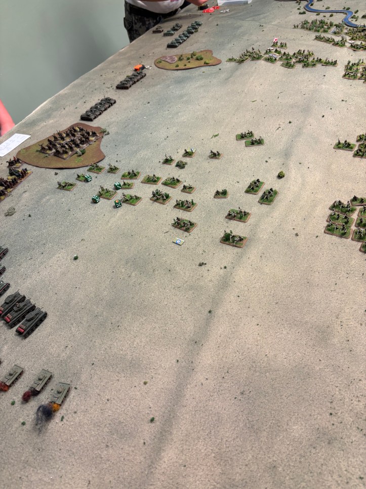 The Soviet infantry moves on to the board where it proceeded to get shot up but infantry and artillery and spent the game hiding in the marsh. The BT-7’s controlled by my son rolled on, he split 5 to support the infantry and 5 to go help relieve the Soviets defending their side of the battlefield.