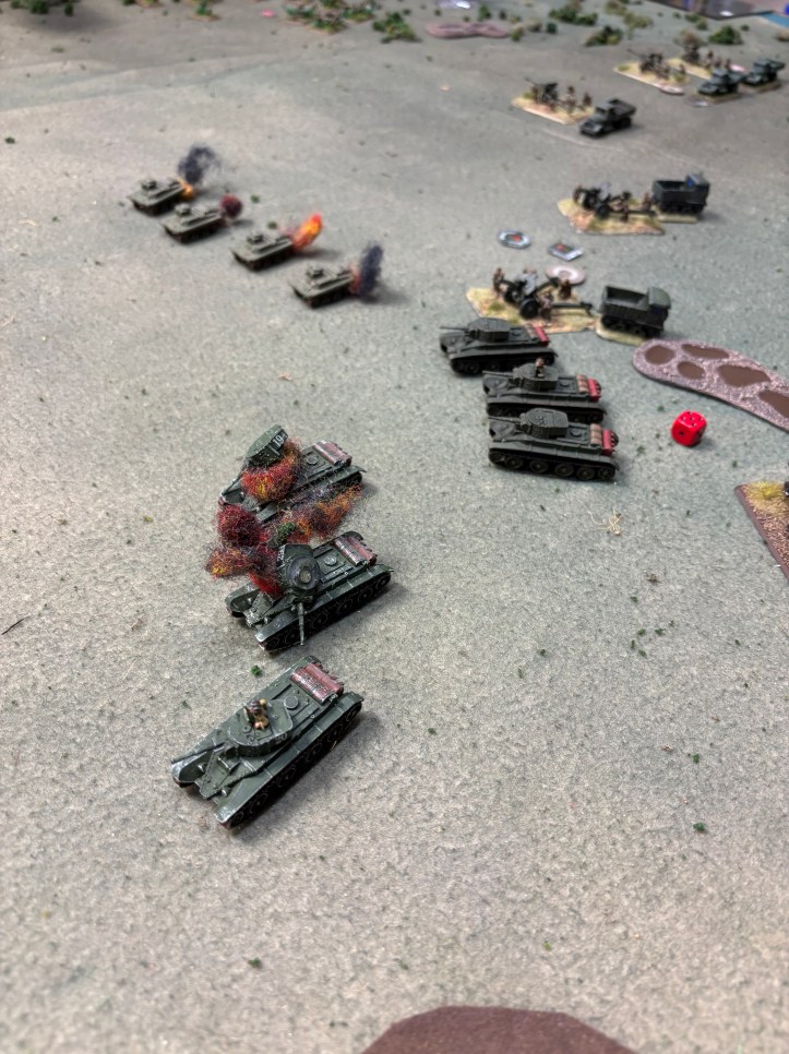 Artillery fire continued to take it’s toll on the Soviet armor! (The GM read somewhere that the BT-7’s at this time were susceptible to overheating or some such and so reduced their top armor to 0. In return he increased their assault from a 5+ to hit to a 4+ to hit.)