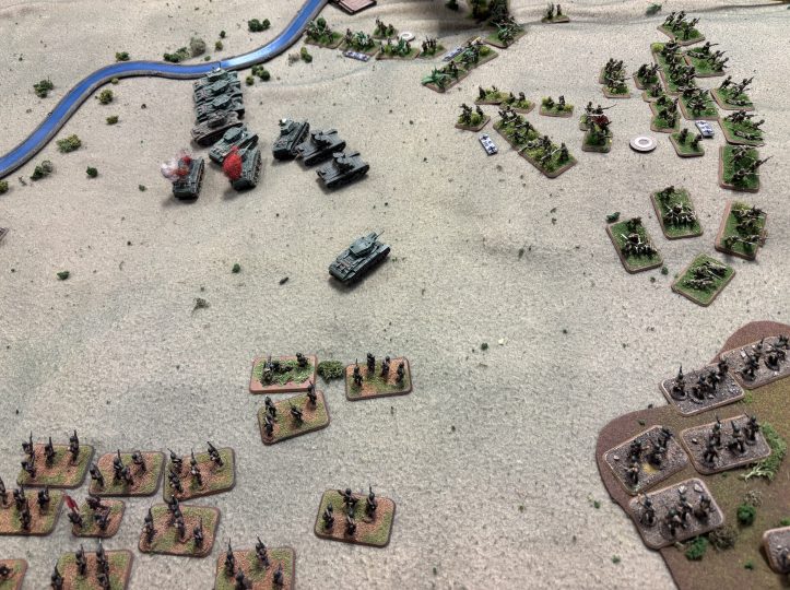 The Japanese launch an attack on the BT-7’s (these BT-7’s are mine!) They knew a few of them would die but due to their rules they knew the assault would go through, and being able to turn three stands into troops with a high assault value the Japanese player thought it was worth the risk.