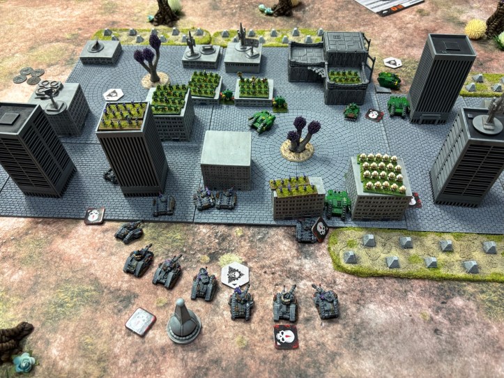The Chimeras rolled up and dropped off their Guard squads on and around the objective building.