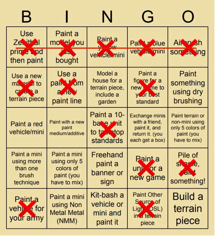 Oh, and the cool thing is I get another Bingo square for “use a new material to create a terrain piece” from them as I don’t think I’ve ever used spackle as part of a terrain piece! I definitely haven’t used pumice for anything beyond bases so I guess if I have used plaster the pumice counts! I could claim “paint something using dry brushing” and “build a terrain piece” as I did ten separate pieces but I don’t feel that goes with the spirit of the game!