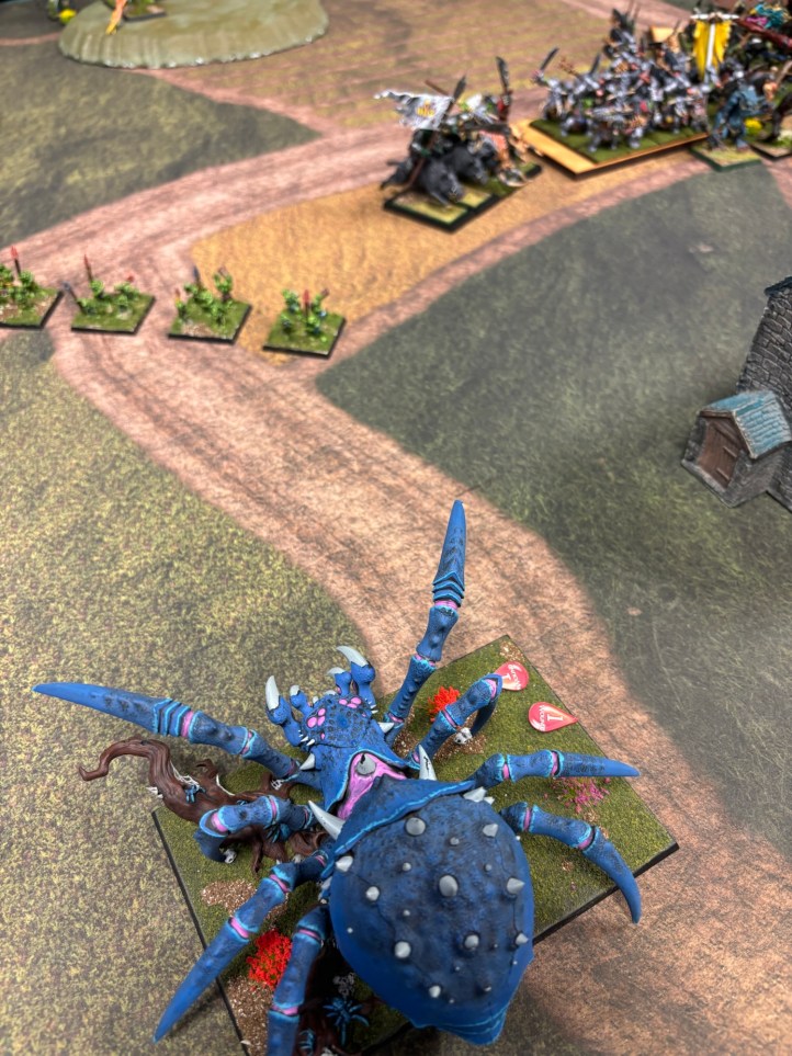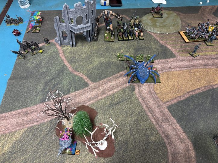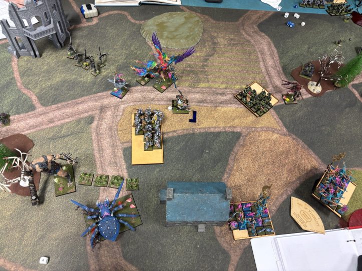 On the right flank the Lord of Change flew to get closer to the orcs and the Burning Chariot flew over the woods to cause problems for the orc left flank. The flames of Tzeentch killed two Spider Riders who promptly turned and fled!