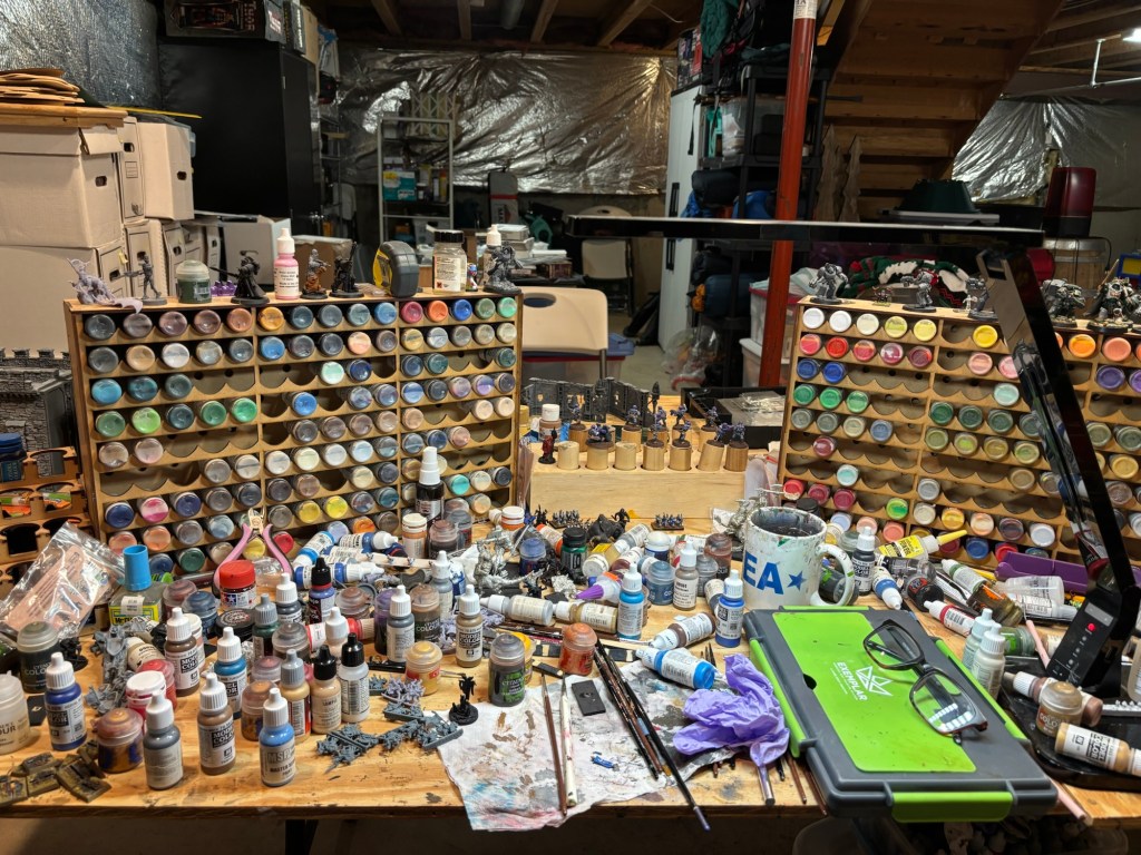 Before and after of my painting area. At least the dropper bottles ended up mostly put away….
