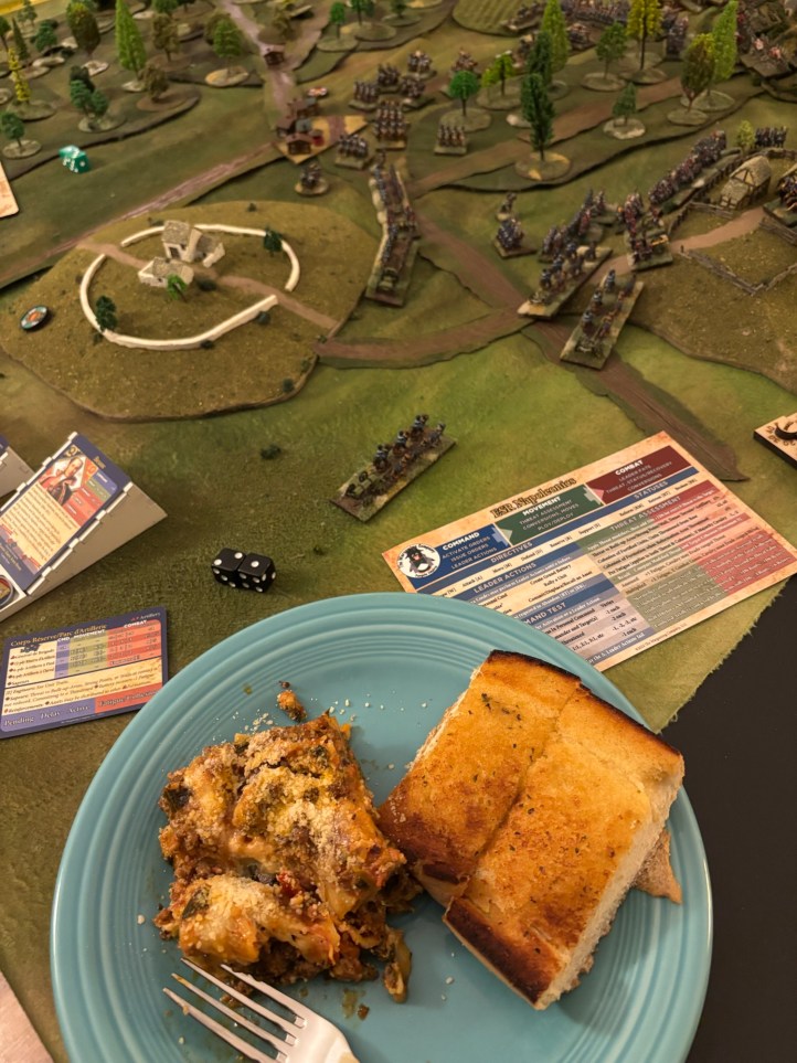 In case you were worried, we did have dinner. Amongst the field of battle we feasted upon meat lasagna and garlic bread. The lasagna had beef, pork, chicken, and vegetables. Not a combo my Italian wife would put together but tasty none-the-less. Plus it tricked me into eating vegetables!