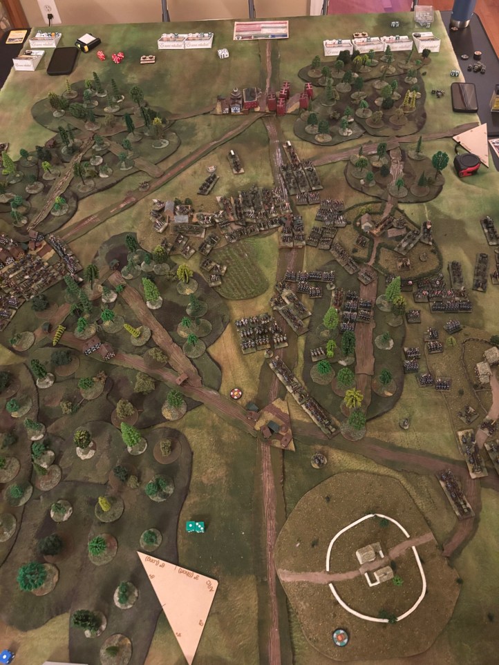 Tonight my group met up and played Et Sans Resultat (ESR) from The Wargaming Company. We had two players on the Russian side, and two on the French. We didn’t play a historical battle so the goal was just to destroy the enemy forces. The two sides were fairly evenly matched, although the Russians had a distinct edge in artillery support and the French had to move up in terrain that was more broken up by bad terrain. (Only the main road through the middle of the board was classified as a road. Everything else was a trail with the same movement rating as the terrain it ran through. The only benefit was it allowed troops on a Move order to follow the trails instead of heading straight to their objective.)