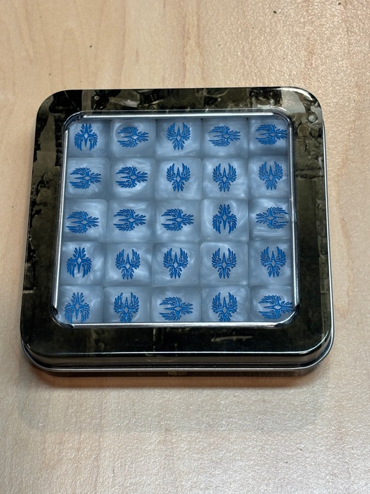 The dice are provided with a nice layer of foam so they are not only held in tight but are well protected. You get 25 16mm dice in each set and have the option of choosing rounded edge or square edge, you also have the option to get the smaller 12mm dice. The designs replace the 6 on the dice and are nice and crisp. I love the subtle marble effect and the color scheme will fit perfectly with my Warmaster High Elves. I mean, why wouldn’t I but dice for a game I’ve never played with an army that still isn’t painted?