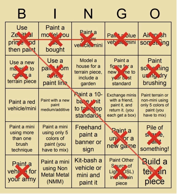 I think this will be the last row I end up getting this year. I could knock out another figure using only 5 colors, I got a bingo square with that last year which earned me a last minute bingo, but I have to finish some Warmaster and I’m getting to the end of the month. I definitely don’t have time to model a house with or without a garden! Still, I finally got two row of a Hobby Bingo board, and was real close to having three, if not four rows. I guess next years goal is three rows!