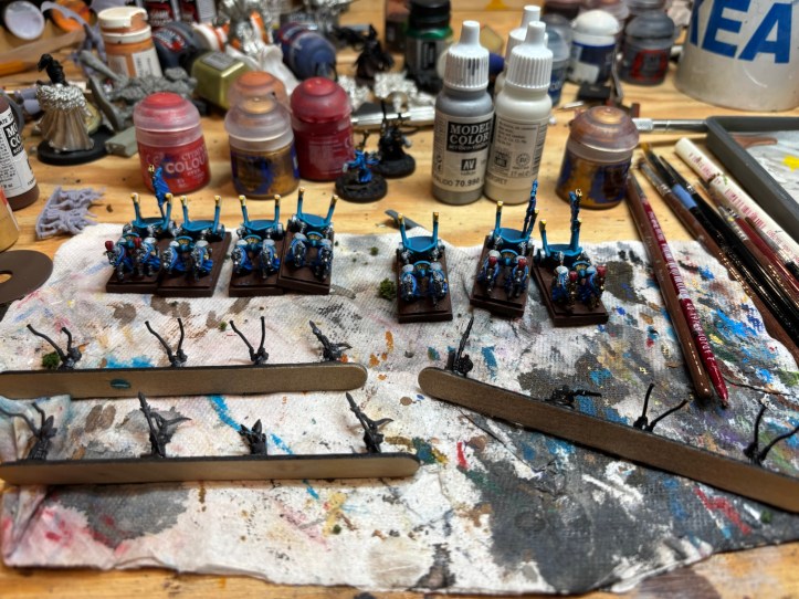 Besides that two of us painted Warmaster, and our other friend just hung out and kibitzed for a while. I finished off the chariot bodies that have been frustrating me since the beginning of the challenge and now that I’m only a few riders away I think I’ll finish in time to complete them by the end of the month. If I’m quick enough I’ll finish my two characters and be down to just two units, one of Silver Helms, and one of Reavers. Wish me luck!