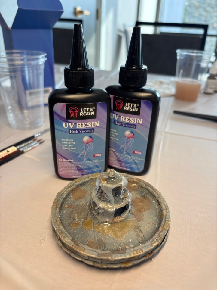 After that the I tore the water effects into strips and glued them in the fountain with super glue as you can see in the pictures above. I then used Let’s Resin, UV resin, High Viscosity and poured it into the bottom of the fountain and the top sections. I ran the resin down a popsicle stick which helps remove bubbles as the resin settles. Once that was done a few minutes under a UV light and it was all done!