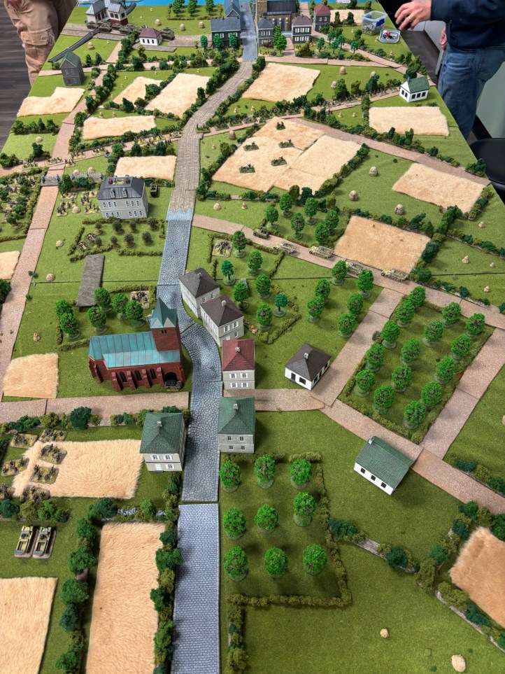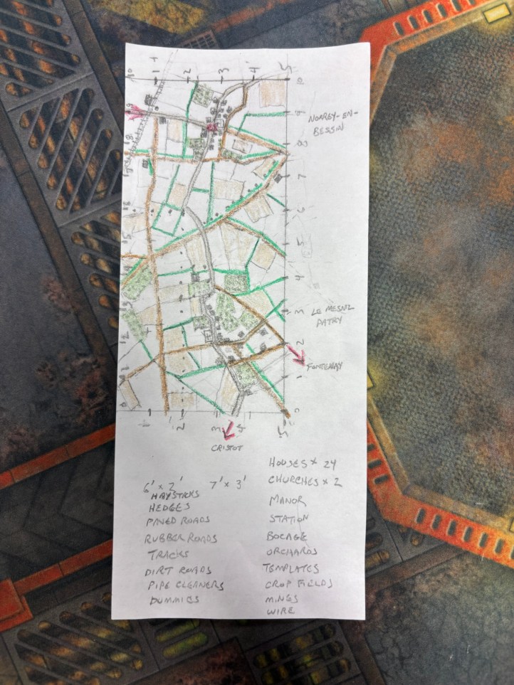 Ideally the game was set to last 16 turns, although as always we had a time cap as well based on the stores table needs. As always there were multiple levels of victory for each side, some of which overlapped, some of which didn’t. The Germans would win a major victory if they could defend Le Mesnil-Patry without any Canadians entering the village and take the village of Norrey-En-Bessin, a solid victory if they could defend Norrey-En-Bessin without any Canadians entering the village, and a minor victory if the Canadians entered the village but the Germans were able to re-take it. The Canadians would have a major victory if the could get off the board at one or both of the red arrows, a major victory if the could take the whole of Le Mesnil-Patry or a minor victory if they took part of the village.
