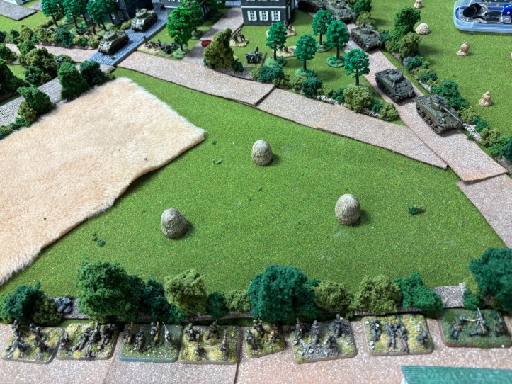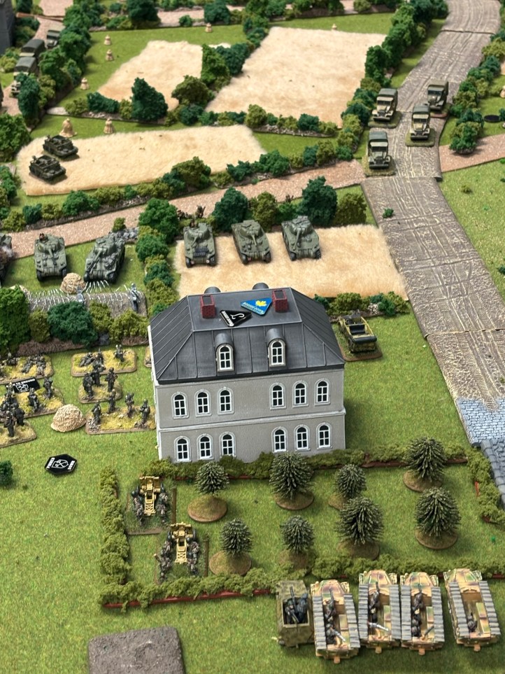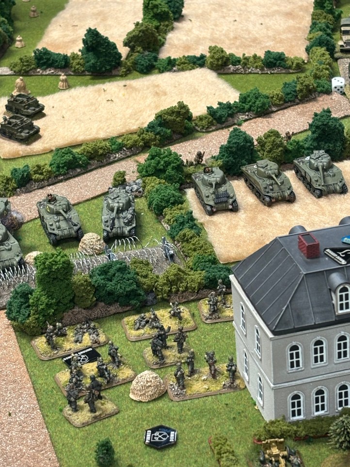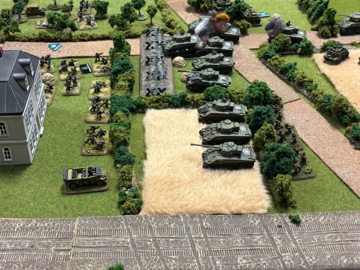 Having finished off majority of the Germans defending the road, with only a few stands breaking contact and making their way back to friendly lines, the Shermans continued to try and crack the strong point of the mansion.