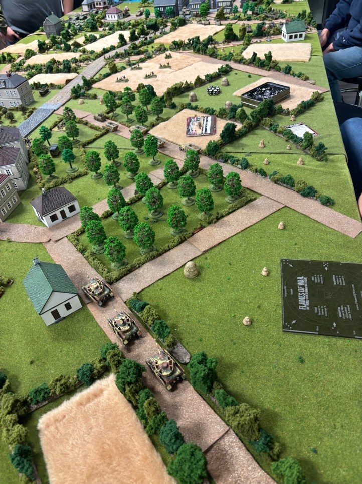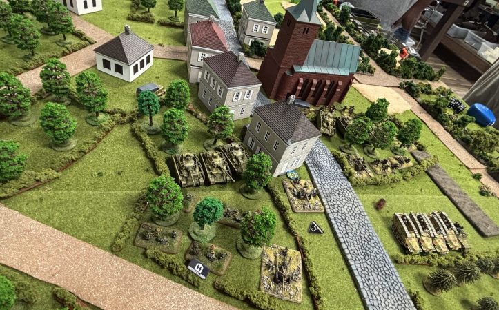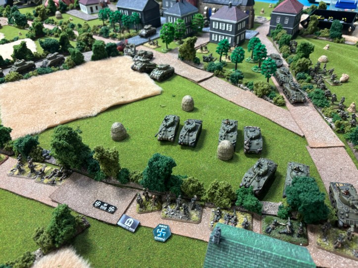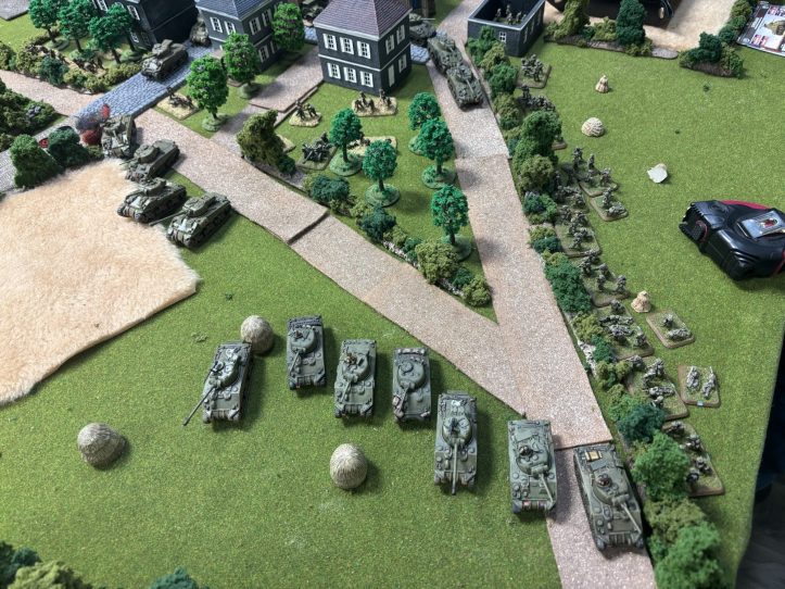 As the Shermans on the right were moving faster the PzIV’s took up a position of cover to make their advance more difficult. The half-tracks loaded with panzerschreck teams rolled towards the mansion to the north of town to take cover in the building and bunker up to cause the Canadian spearhead on the left flank a headache.