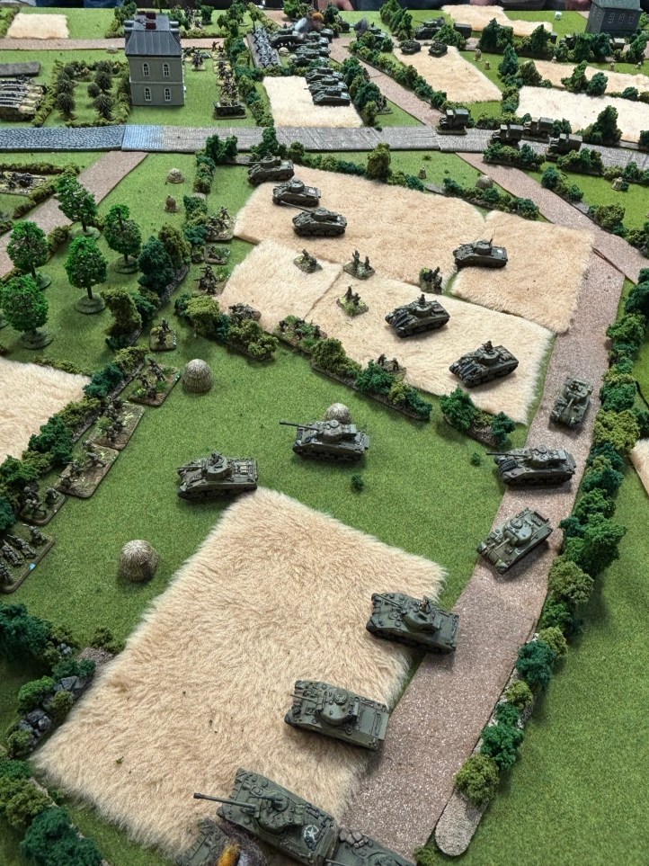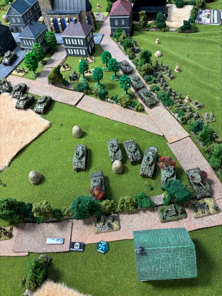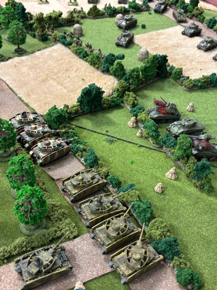 The PzIV’s moved up and opened fire on an advancing platoon of Shermans causing significant damage, knocking out two of the tanks.