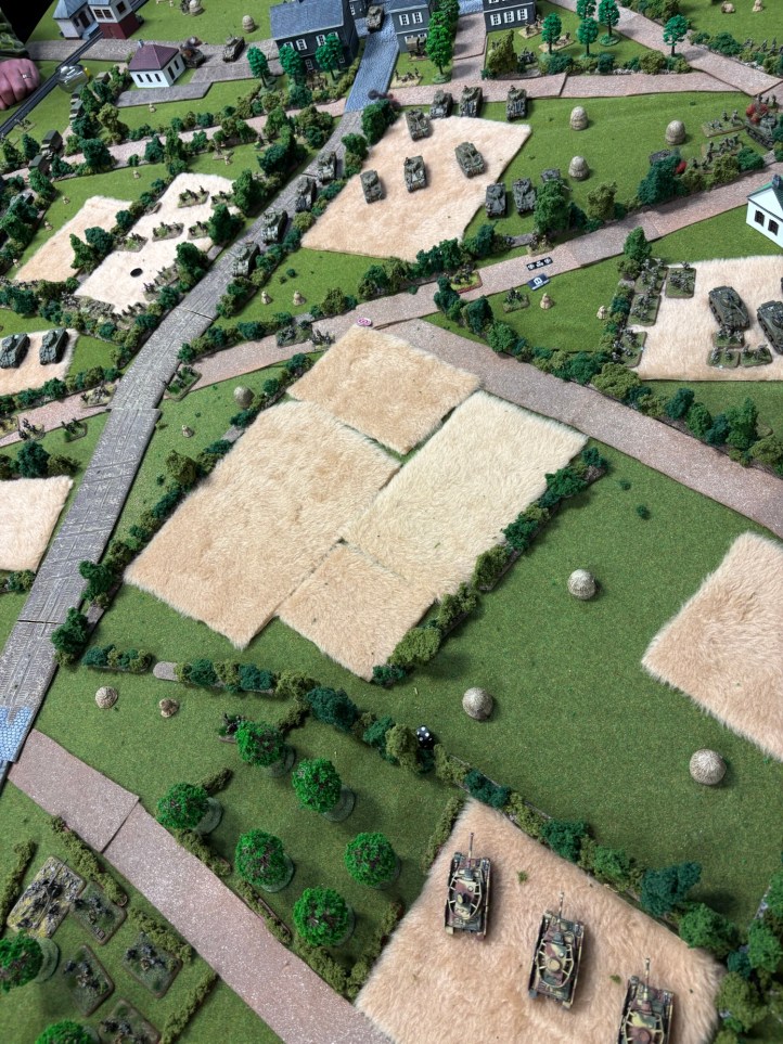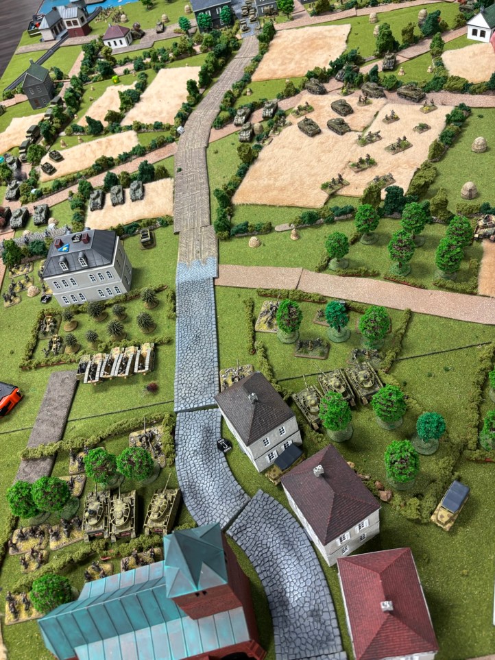 The PzIV’s rolled on to the board and were faced with quite a few choices of which direction to move towards as the line was being threatened at multiple points! On the road parallel to the panzers the halftracks were loaded down with panzerfaust teams idling while facing the same decision as the panzers!