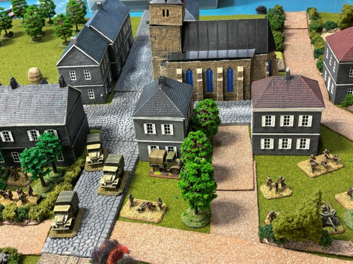 Canadian author Terry Copp stated the plan for this battle was “Conceived in sin and born in inequity” and while the Canadian players might have felt the same way about the scenario at the end it was a fun hard fought game, and most importantly I got to hang out with my friends and one of my sons! The Canadians did an excellent job at the beginning of the game aggressively driving the German right flank. They ended up bogging down as they tried to shoot the remnants of the surviving members of the platoon that was guarding the road and were rightfully nervous about the mansion that had a panzerfaust sticking out of every window! For a time it appeared as if the artillery was going to quickly eliminate the troops in the mansion, but even though it was going well it didn’t go fast enough. This allowed the Germans to consolidate their hold on the village and prevent the Canadians from wresting control!