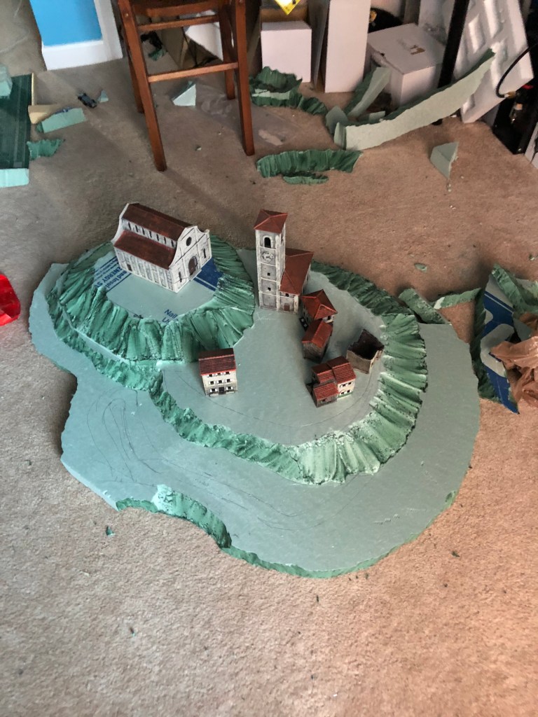 The Mountain itself is crafted out of two inch thick insulation foam cut into shape with a hot knife. Prior to cutting the mountain I laid out my buildings to see if I’d like the shape and size. The buildings are pre-painted buildings from The Miniature Building Authority which have been discontinued as they are longer in the 15mm business. I had borrowed a friends 120w knife but that quit on me so I bought this 150w monster. https://www.amazon.com/Gino-Development-01-0699-Adjustable-Temperature/dp/B007XC0ZOY/ref=sr_1_14?keywords=foam+knife&qid=1551846502&s=gateway&sr=8-14 This did the trick and went right through the foam. I don’t know if having only one open window was enough to dissipate the fumes so I’d be more careful than I was with that. . . . The layers were glued together with liquid nails. I used plastruct plastic sheets to create a town square and a base for the church to sit on. I used fieldstone and brick. I cut the brick both the long and the short way so I could have brick courses going in different directions. Yes, I’m nuts. I also cut out a switchback road with the hot knife going up the mountain. Finally the whole thing was glued on to a piece of MDF which I cut into shape.