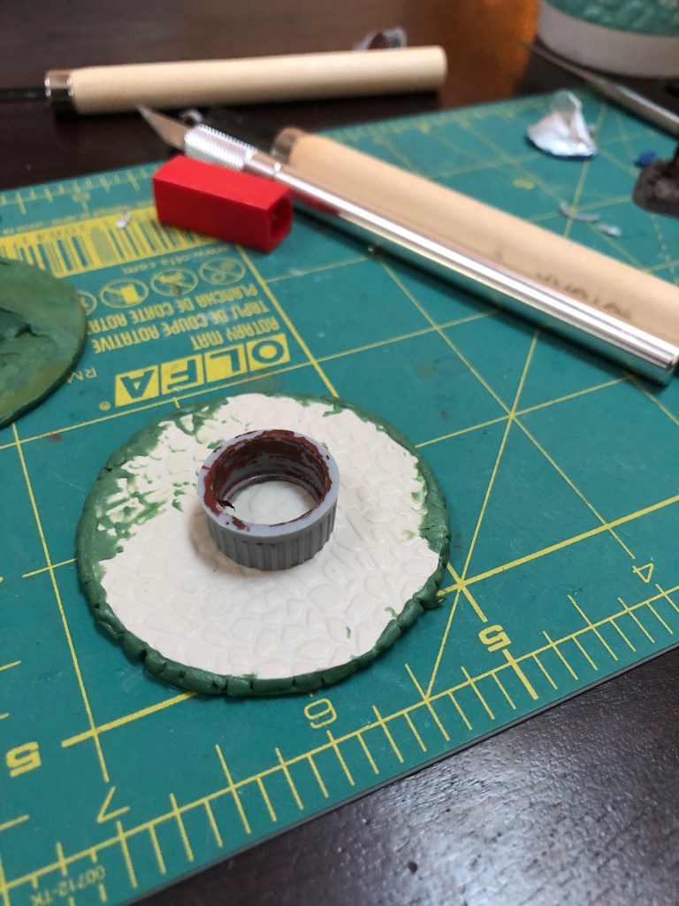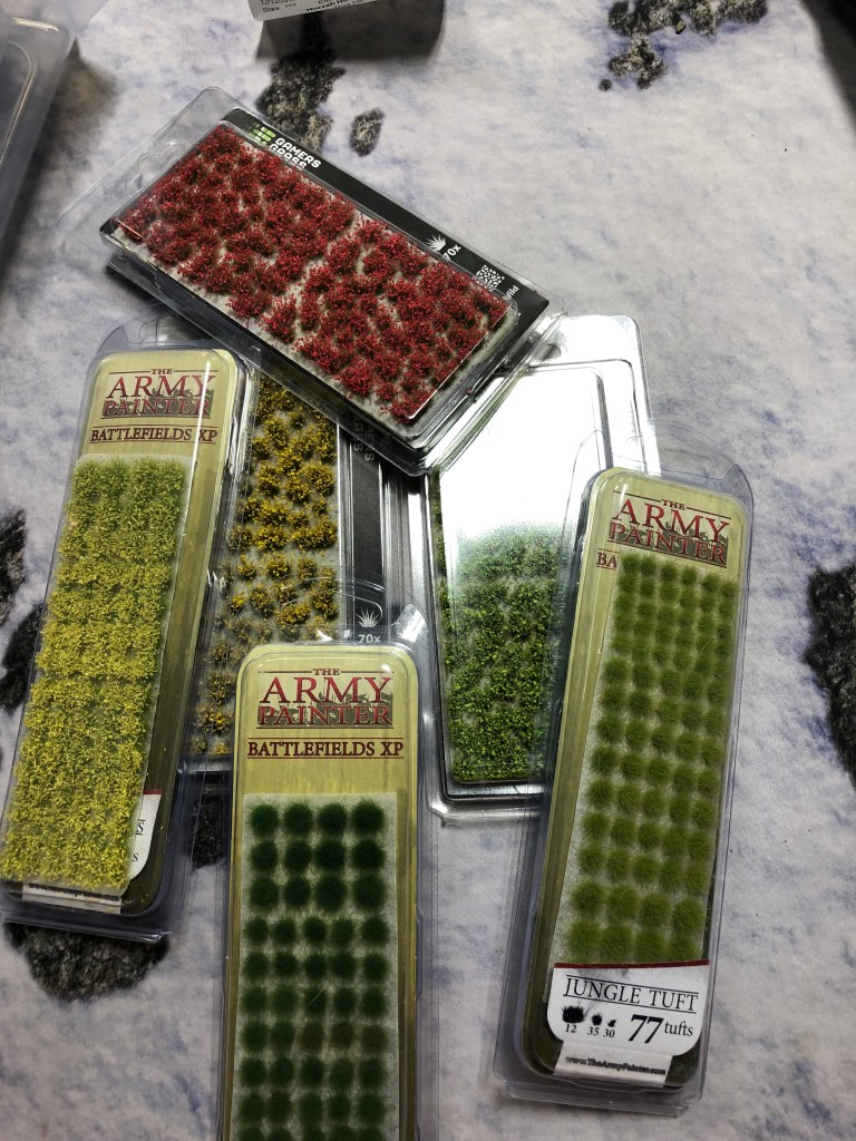After the basic assembly was completed I sprayed the whole thing with spray paint and let it dry. WARNING: If you didn’t already know it spray paint can eat Styrofoam and ruin your work. With baited breath I followed The Terrain Tutors advice on using spray paint on sytrofoam safely and it worked without problem! https://www.youtube.com/watch?v=dpVg9kCNBjk It was a nerve racking process though! I then painted the mountain and the town square with Gregory Zuniga’s (Wicked Elf) wet blending technique which I learned by taking his class at Fall In! 2019. If you get a chance to take one of Greg’s classes you should! Next up I applied flock and a ton of flowers and static grass tufts. I then applied some weathering powder to the stones and bricks and dull coated the entire thing. After setting it all up I realized that the town was missing a water supply so I created a well with the top of a Vallejo paint dropper bottle, a plastic Renedra base and more plasticard. Done! The trees were all provided to me by Don Goddard another one of the Hobby University instructors. He teaches a class titled Twisted Wire trees and he can really pump out some forests! He saw me post the mountain on a Facebook group we are in together and offered to make me some trees and ship them to me. I asked for 30 and five days later they arrived in the mail! If you get a chance to take his classes I highly recommend them. There is one Hobby University student that attends his Twisted Wire Trees class at every convention. This guy has to have enough trees to cover a 5’x10′ table by now!
