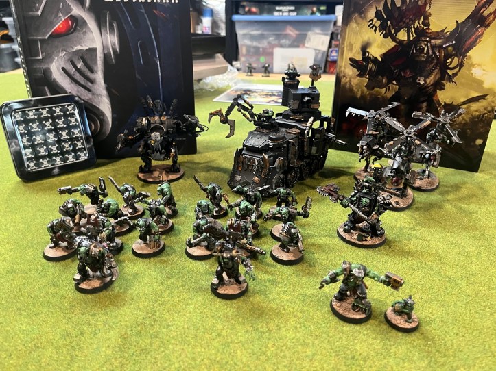 He’s not done painting yet and is currently working on another unit of 20 boys! He really wants to do a horde army, so it’s a good thing I’ve been buying him older edition boys at various flea markets for the last few years! Shoot, I just saw the Battlewagon is $130 and I managed to get him two over the years for about $30!