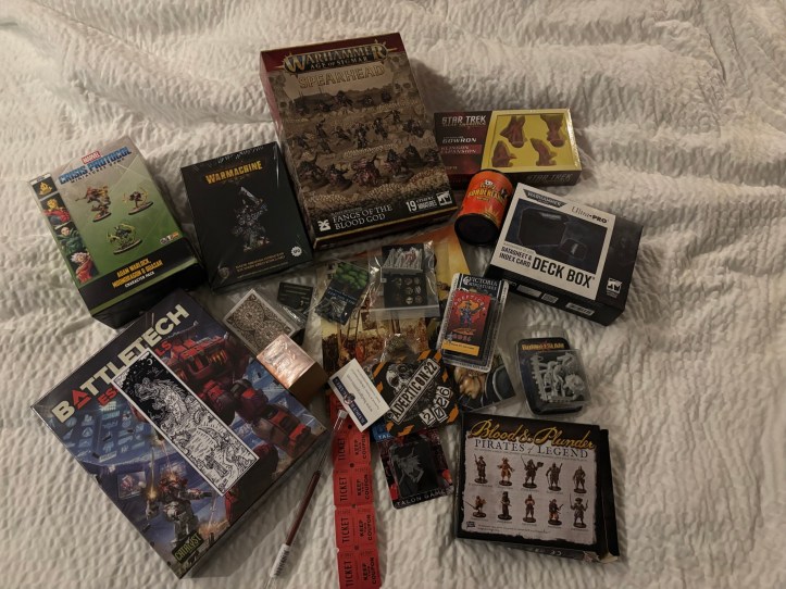 I came back and put on my usual show and tell of purchases and haul. Not a bad pickup this year! Not pictured are the various items I picked up for friends who couldn’t make this how. One of the Arena Rex figures was from the (participation) prize pile at the Arena Rex tournament. Is it bad that my favorite purchase was the $6 “Killer Kan feet” at the bottom of the picture which were 2nd Edition Chaos Dreadnought feet?
